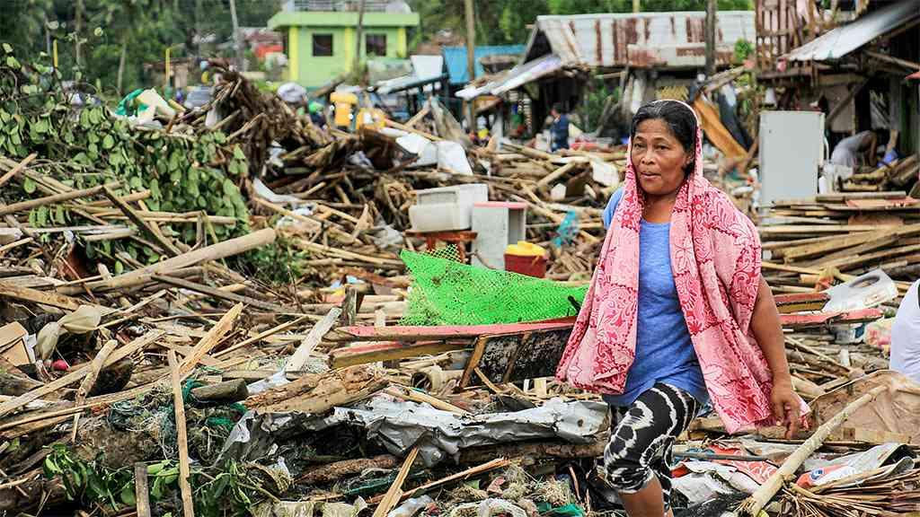 Moradora de uma das áreas atingidas pelo tufão, nas Filipinas, caminha entre os escombros