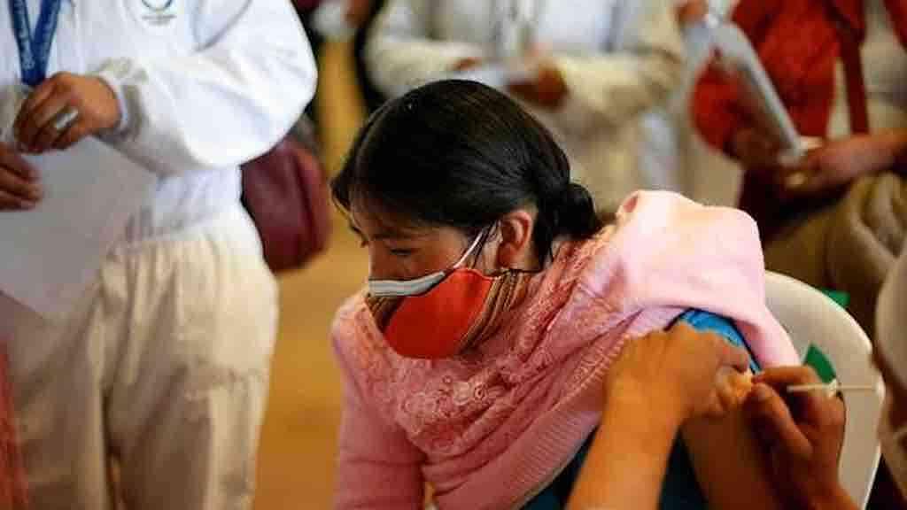 Mulher recebe vacina contra a covid-19 em El Alto, Bolívia