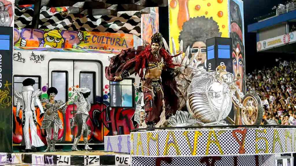 Um dos carros alegóricos que mais chamaram atenção na noite trouxe uma escultura enorme da estátua de Borba Gato, incendiada, e logo abaixo a presença do militante Paulo Galo e o ministro Silvio Almeida (Direitos Humanos). Paulo Roberto da Silva Lima, o Galo, foi preso e condenado por incendiar a estátua do bandeirante escravocrata paulista, em Santo Amaro, zona Sul da capital paulista.