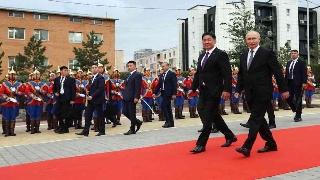 Putin desembarcou na segunda à noite na capital da Mongólia e foi recebido nesta terça-feira pelo presidente do país, Ukhnaagiin Khurelsukh, na imponente praça Genghis Khan, com uma grande cerimônia.