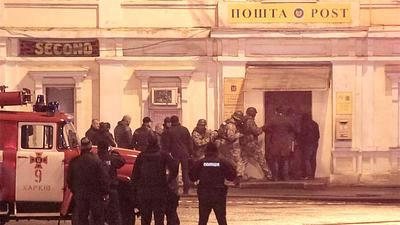 Na Ucrânia, a televisão mostrou policiais e carros de polícia estacionados fora de um edifício de dois andares; branco e amarelo, na cidade localizada no nordeste do país.