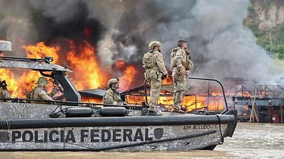 Ação coordenada pelo Centro de Cooperação Policial Internacional da Amazônia (CCPI Amazônia) resultou na destruição de dragas utilizadas para mineração ilegal entre os municípios de Manicoré e Humaitá.