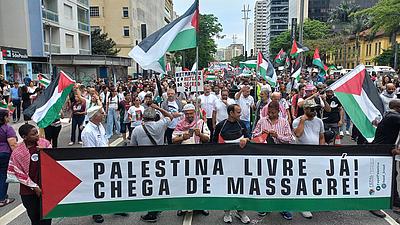 O ato é um dos vários que ocorreram neste final de semana em solidariedade à Palestina e exigindo o fim dos ataques de Israel contra a Faixa de Gaza. Protestos levaram centenas de milhares às ruas em ao menos 16 países.
