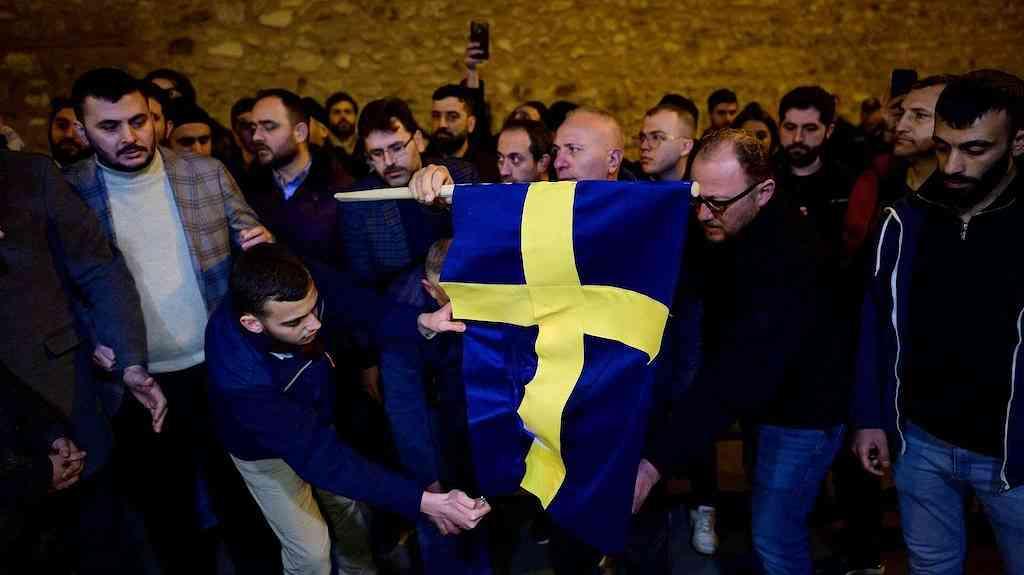 Ainda no sábado, manifestantes incendiaram uma bandeira sueca em Istambul em resposta à queima pública de uma cópia do Alcorão por um ativista anti-islâmico perto da embaixada da Turquia em Estocolmo.
