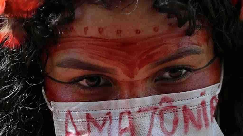 Mulher indígena protesta contra Bolsonaro em Brasília em abril de 2020: a maior parte (75%) dos assassinatos de ambientalistas brasileiros em 2020 ocorreu na Amazônia e vitimou indígenas