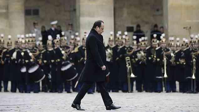 Em homenagem, duas semanas após atentados, presidente francês promete destruir o "Estado Islâmico" e pede a franceses que respondam ao "exército de fanáticos" com música