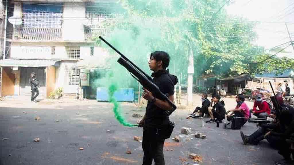 Manifestantes contrários ao golpe militar feito em Myanmar reagiram com armas caseiras e coquetéis molotov a uma repressão de forças de segurança em uma cidade do noroeste, mas ao menos 11 manifestantes foram mortos.