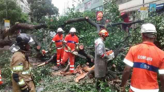 Uma equipe da prefeitura retirou os galhos da árvore derrubada pelo vento, em Copacabana
