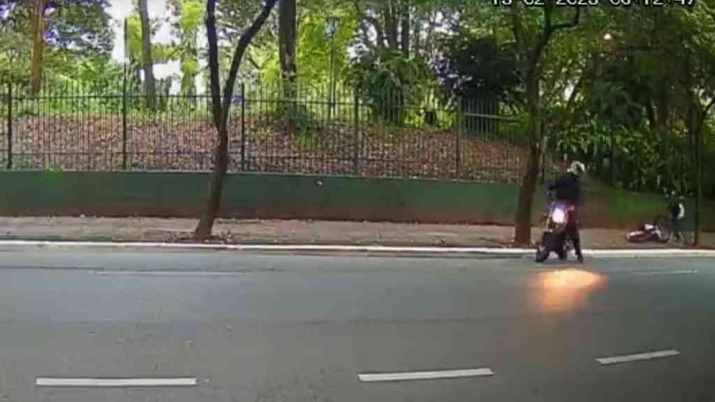 Câmeras de segurança mostram Vitor Medrado parado na calçada, por volta das 6h12, aparentemente mexendo no celular, quando é abordado por dois homens em uma moto.