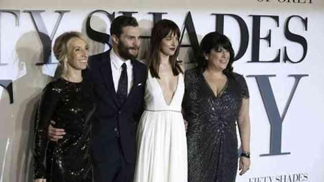 Diretora Sam Taylor-Johnson, atores Jamie Dornan e Dakota Johnson e autora E. L. James na pré-estreia de "Cinquenta Tons de Cinza" em Londres