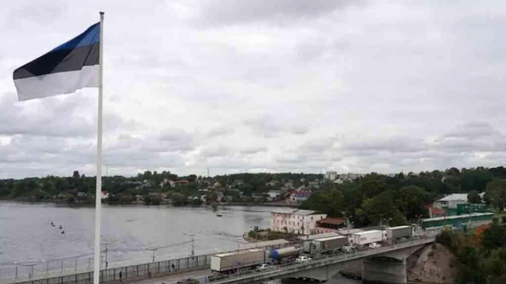 Bandeira da Estônia tremula perto da ponte sobre o rio Narva, no ponto de passagem da fronteira com a Rússia em Narva