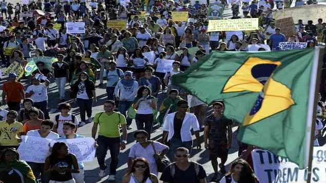 Manifestantes se reúnem, neste domingo, em Brasília, a favor do impeachment da presidenta Dilma Rousseff. Eles deixam o Museu da República, na Esplanada dos Ministérios, rumo ao Congresso Nacional segurando faixas com frases pró-impeachment.