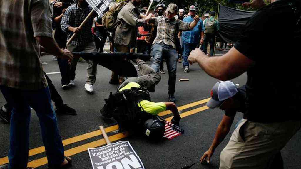 Confronto entre membros de protesto de supremacistas brancos e grupo de manifestantes de oposição em Charlottesville, nos Estados Unidos