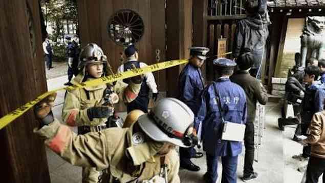 Policiais e bombeiros no Santuário Yasukuni, após explosão, em Tóquio