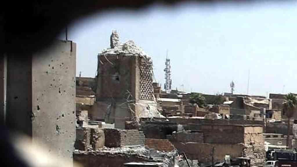 Os insurgentes explodiram a mesquita medieval e seu característico minarete inclinado uma semana atrás. Enquanto forças iraquianas apoiadas pelos Estados Unidos iniciavam o avanço em sua direção.