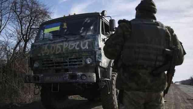 Veículo militar das Forças Armadas ucranianas vistas perto de Artemivsk