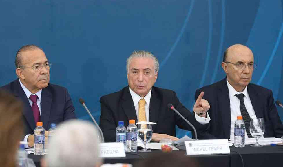 Temer, ao lado do chefe da Casa Civil, Eliseu Padilha, e o titular da Fazenda, Henrique Meirelles