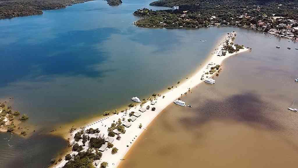 Faixa de areia separa águas barrentas e claras no balneário turístico de Alter do Chão (PA)