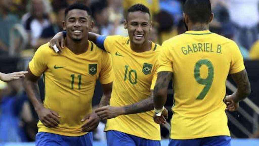 Atacantes brasileiros Neymar, Gabriel Jesus e Gabriel comemoram gol contra Honduras