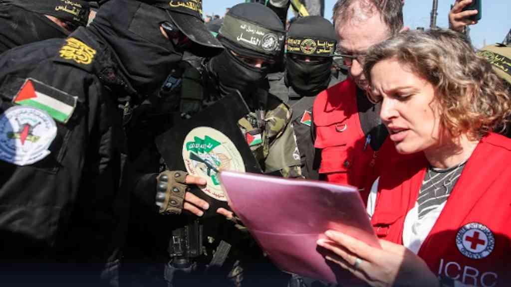 Mais cedo, em Jabalia, no norte de Gaza, uma soldado israelense, Agam Berger, vestindo um uniforme verde-oliva, foi conduzida por um beco estreito entre prédios altamente danificados e sobre pilhas de entulho antes de ser entregue à Cruz Vermelha.