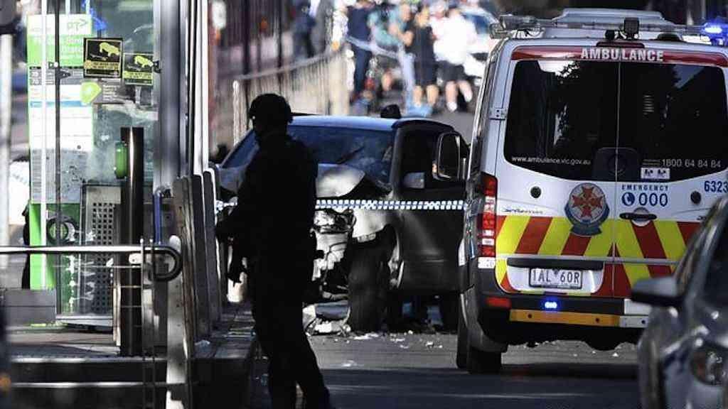 Um SUV branco atropelou vários pedestres numa movimentada rua perto da estação de trem Flinders Street, no centro comercial da cidade, no meio da tarde.