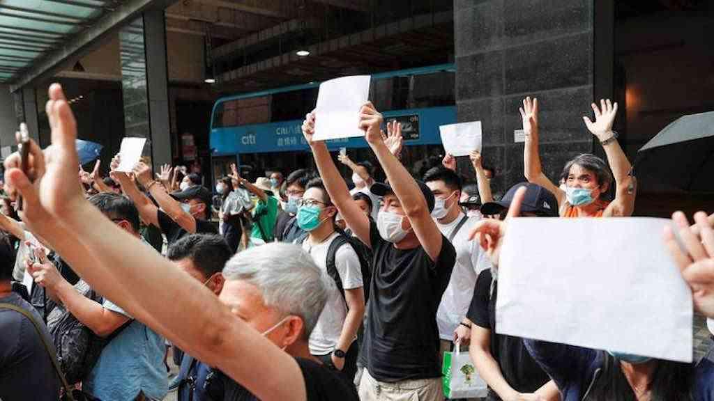 Manifestantes mostram cartazes em branco após slogan ser proibido em Hong Kong