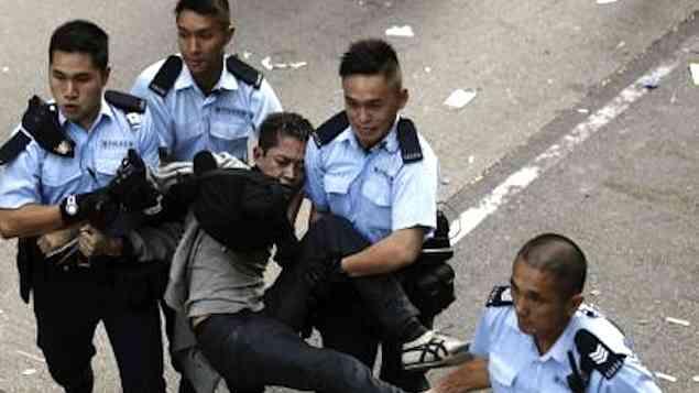 Polícia e manifestantes entraram em um breve conflito em Hong Kong nesta terça-feira quando as autoridades dispersavam um acampamento pró-democracia no movimentado distrito de Mong Kok, após determinação judicial para liberar as vias do local, e diversas pessoas foram levadas em carros da polícia.