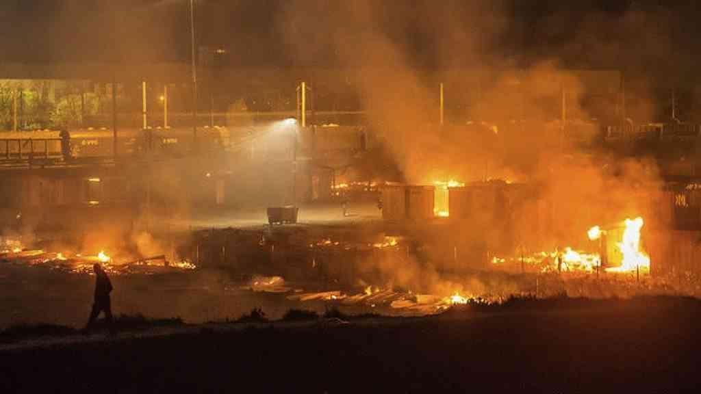 Um incêndio de grandes proporções destruiu na noite anterior grande parte de um dos maiores campos de acolhimento de refugiados da França