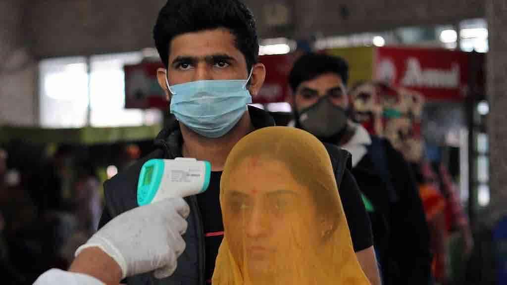 Um trabalhador de saúde em equipamentos de proteção individual (EPI) verifica a temperatura dos passageiros em meio à propagação da doença na Índia