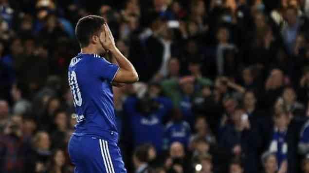 Eden Hazard lamentando perda de pênalti em partida contra o Maccabi Tel Aviv, em Londres