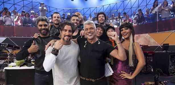 Marcos Mion posa com Lulu Santos no palco do "Legendários" Fantasiados de Britto Jr (esquerda), Justus e Moisés, integrantes do "Pânico" abordam Marcelo Rezende na porta da Record Deborah Evelyn e Tony Ramos nos bastidores de "A Regra do Jogo"
