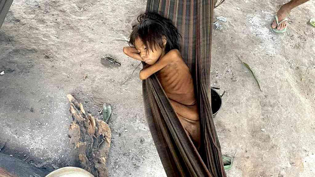 Em uma aldeia Maimasi, em Roraima, uma criança yanomami descansa, sem forças, em uma rede. As costelas expostas pela desnutrição, a malária e a verminose são provas contundentes do abandono. “A primeira equipe médica no local em seis meses não dispunha de medicamentos suficientes para tratar toda a aldeia”, reporta a agência brasileira de notícias FolhaPress.