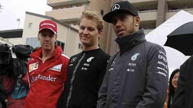 Pilotos da Mercedes Lewis Hamilton e Nico Rosberg e piloto da Ferrari Sebastian Vettel durante evento em Suzuka