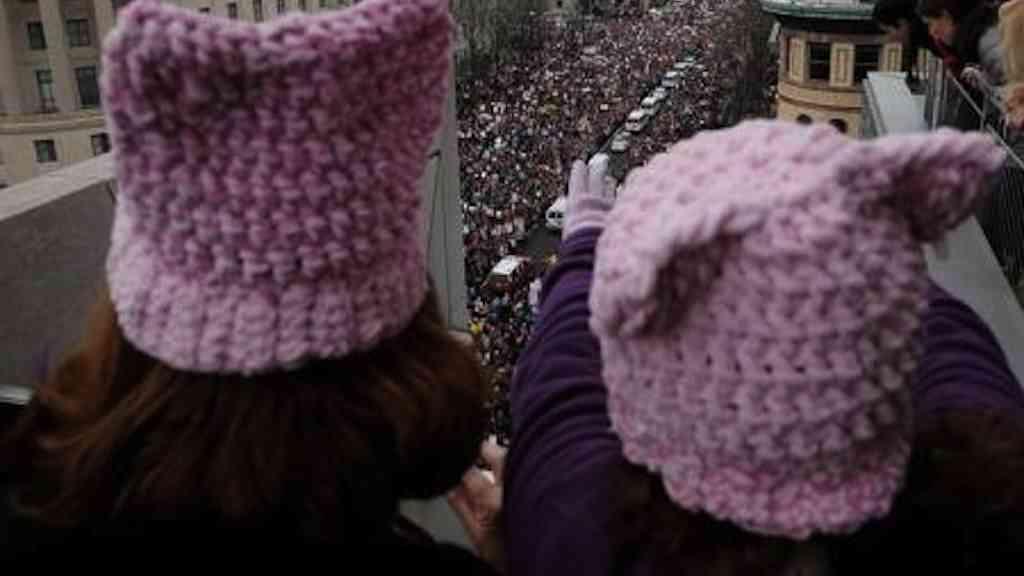 Cantando slogans como "Precisamos de um líder de verdade, não de um tweeter assustador", e "Hey-hey, ho-ho, Donald Trump tem que ir embora". Muitas manifestantes usavam chapéus rosas em referência à frase de Trump. Em um vídeo de 2005 que foi tornado público semanas antes das eleições, sobre pegar as mulheres pelos genitais.