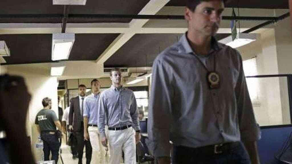 Nadadores dos EUA Jack Conger e Gunnar Bentz em delegacia de polícia do Rio de Janeiro