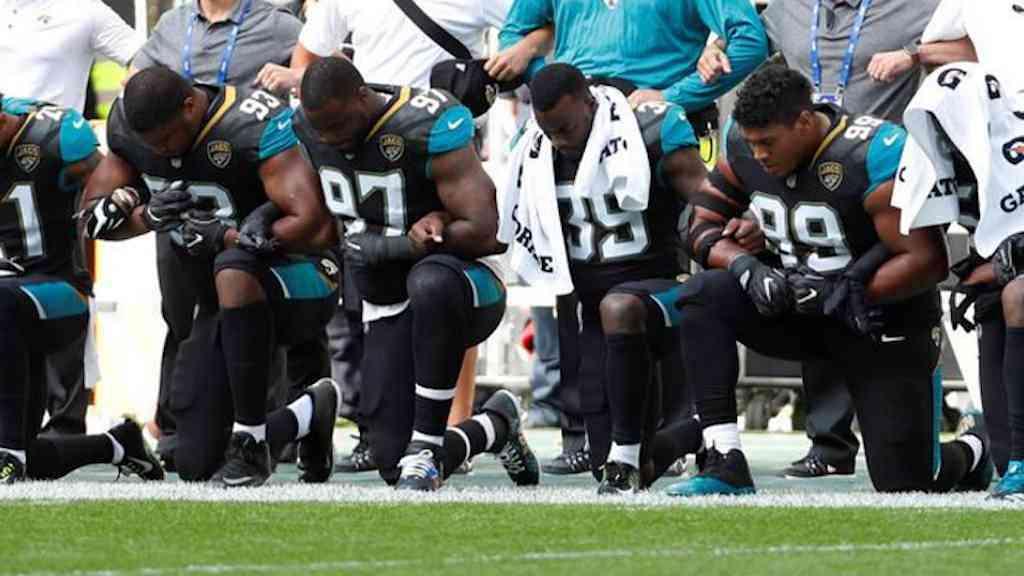Repetindo um gesto iniciado na temporada passada por Colin Kaepernick, à época quarterback do San Francisco 49ers, vários jogadores da NFL passaram a se apoiar