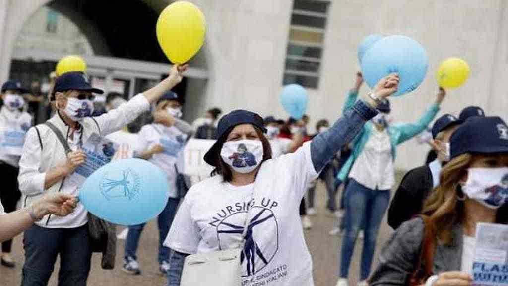 Manifestação de enfermeiros contra gestão da pandemia de coronavírus na Itália, em 9 de junho