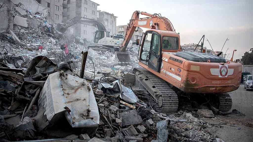 Uma retroescavadeira libera o acesso a possíveis sobreviventes do terremoto que arrasou Antakya, na Turquia[/caption]
