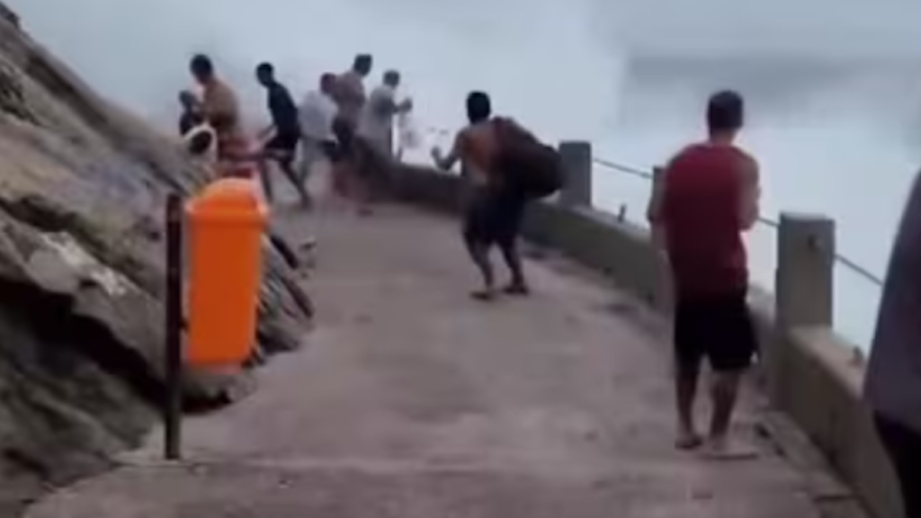 Um vídeo que circula nas redes sociais mostra uma onda gigante arrastando banhistas na Pedra do Leme, na Zona Sul do Rio. Na filmagem, cariocas e turistas apreciam o mar quando são surpreendidos pela força da água, que invade o espaço e carrega as pessoas. Até uma criança é vista chorando no colo do pai.