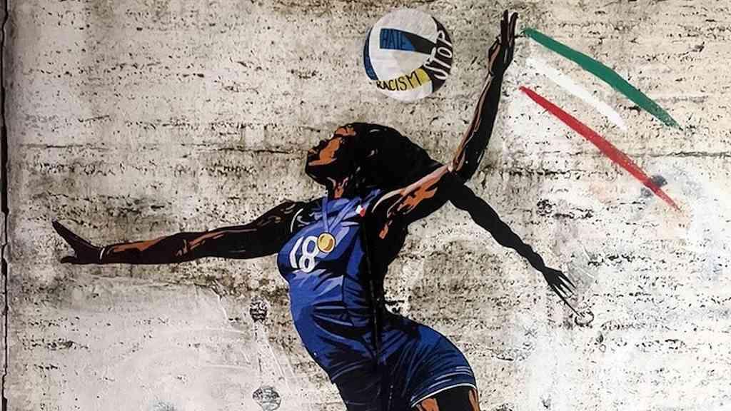 A obra, realizada em frente à sede do Comitê Olímpico Nacional Italiano (Coni), se chama “Italianità” e mostra a atleta golpeando uma bola onde aparece escrito “parem o racismo, o ódio, a xenofobia, a ignorância”.