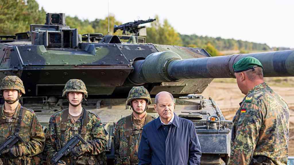 Chanceler federal alemão, Olaf Scholz, ao lado de militares diante de tanque do tipo Leopard