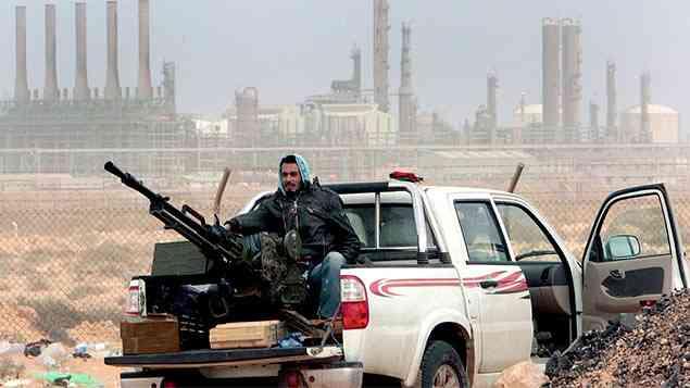 Extremista do EI monta guarda em frente a uma refinaria de petróleo, na Síria