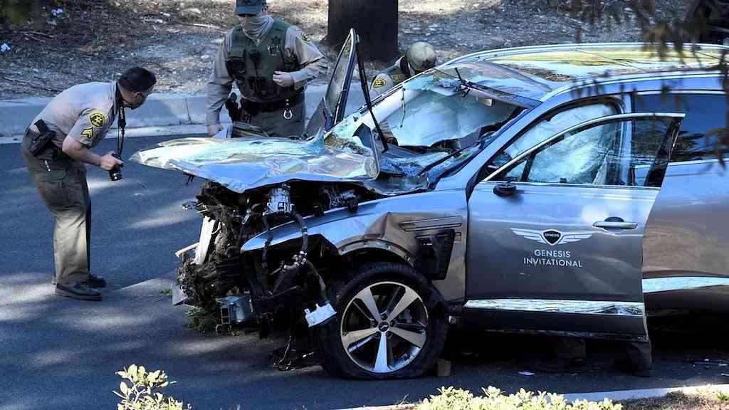 Imagens de vídeo do local mostraram o Genesis 2021 de Woods seriamente amassado, virado de lado e com as janelas quebradas perto do sopé da colina.