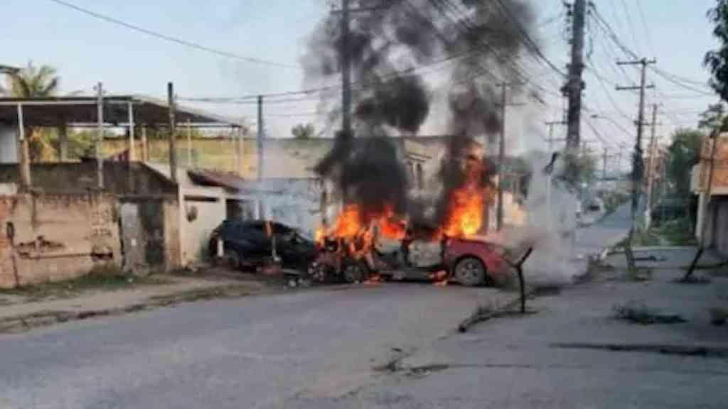 Criminosos reagiram à presença policial ateando fogo em barricadas e carros, dificultando o avanço das forças de segurança em algumas áreas do complexo.