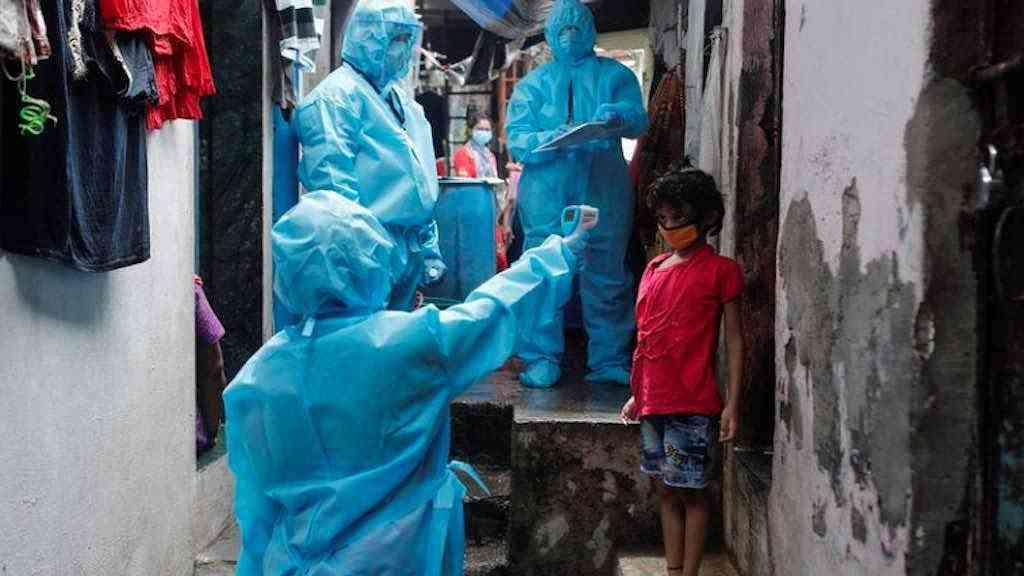 Agentes de saúde medem temperatura de criança em comunidade carente em Mumbai