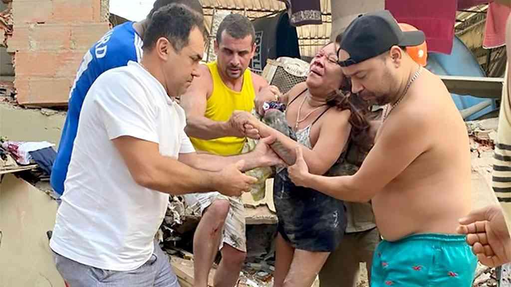 Uma mulher é resgatada com vida dos escombros e levada para o hospital