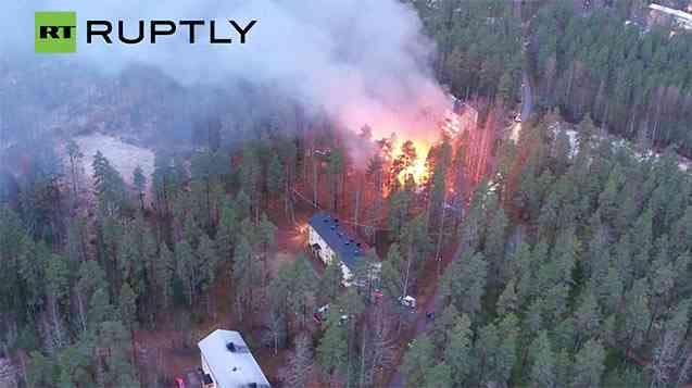 Na Finlândia, um drone registrou imagens impressionantes de um incêndio em um prédio que serviria de abrigo aos primeiros refugiados sírios que chegaram ao país.