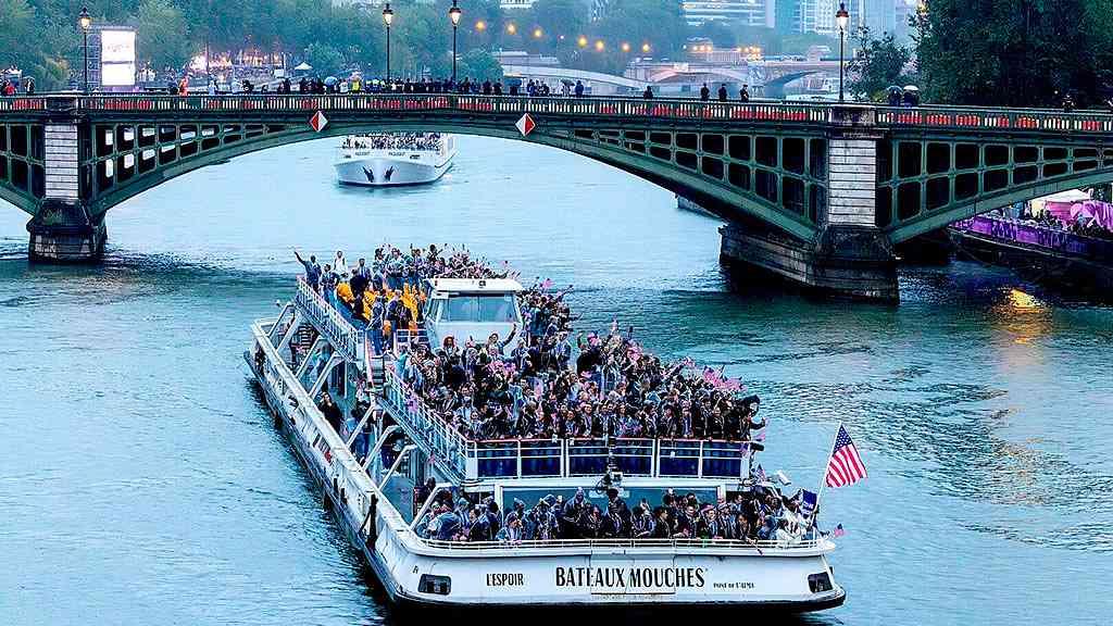 As delegações fizeram o trajeto em barcos sobre o Rio Sena, cujas águas apresentaram bactérias acima do normal, em vez de serem realizadas em estádios, como normalmente acontece. O trajeto teve 6 km e, durante o percurso com os atletas, ocorreram algumas apresentações, incluindo os concertos de Celine Dion e Lady Gaga.