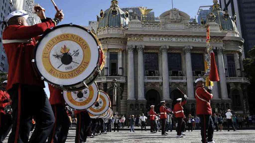 A Banda dos Fuzileiros Navais abriu na manhã desta sexta-feira a comemoração dos 108 anos do Theatro Municipal do Rio de Janeiro (TMRJ), no Centro da cidade, com apresentação na Cinelândia, em frente à imponente construção no estilo eclético. No repertório da banda marcial, muita brasilidade com várias músicas Asa Branca, Feira de Mangaio, Vassourinhas,Cidade Maravilhosa e Aquarela do Brasil, além do tradicional parabéns.