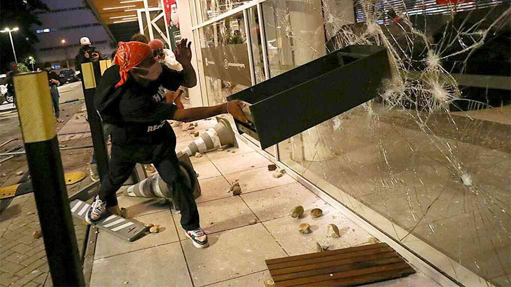 Manifestante quebra uma das vidraças do supermercado Carrefour, em São Paulo, durante protesto pela morte de um homem negro